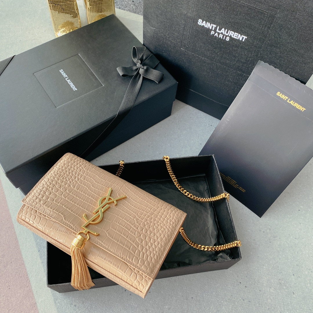 Y*L kate medium tassel in crocodile-embossed leather beige 9.4 x 5.7 x 2.1 inches
